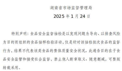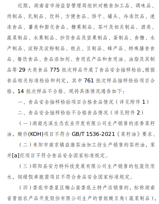 湖南省市场监督管理局关于775批次食品安全抽样检验情况的通告(2024年第30期)
