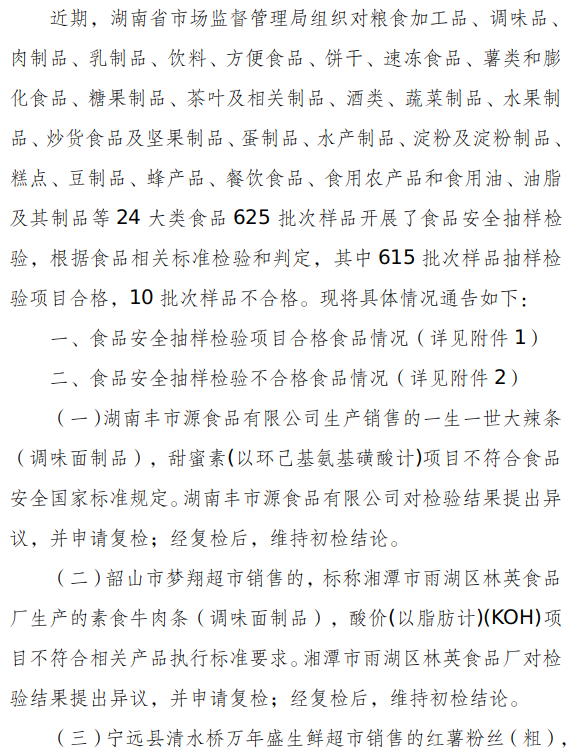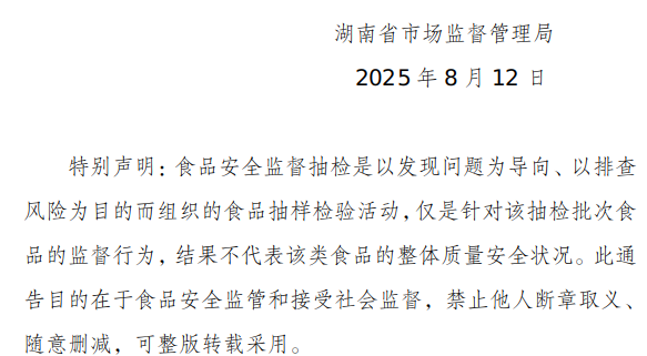 湖南省市场监督管理局关于625批次食品安全抽样检验情况的通告(2025年第15期)